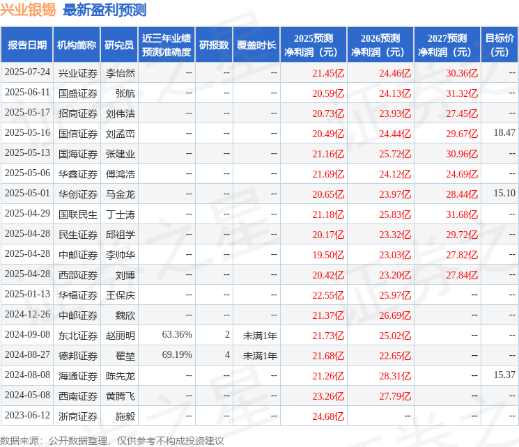 民生证券股份有限公司邱祖学,王作燊近期对兴业银锡(000426)进行研究并发布了研究报告《2025年半年报点评:短期因素干扰业绩释放,未来成长可期》,给予兴业银锡买入评级。
